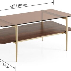 Double Layer Glass Coffee Table for Living Room, Brown Glass & Coffee Brown Bottom Shelf