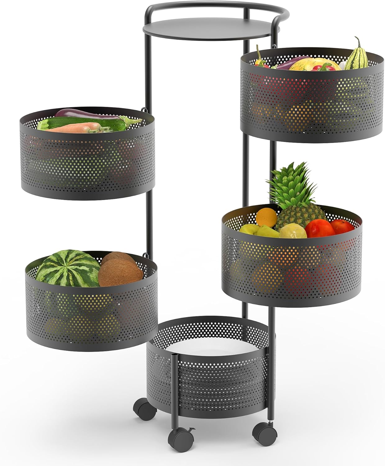 Rotating Fruit Basket, 5-Tier Metal Sturdy Kitchen Storage Rack Shelf Carts No Assembly on Rolling Wheels for Fruit Vegetable Grocery Corns Potato Onion (5-Tier, Black)